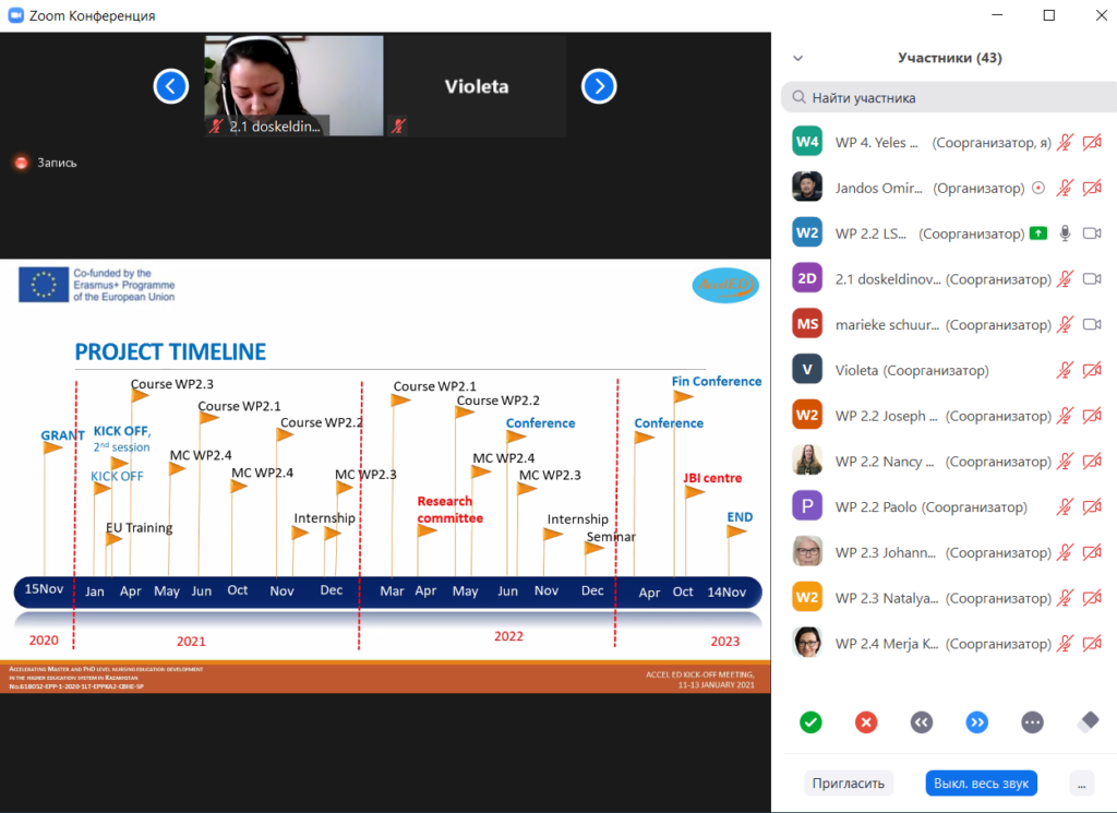 In this regard, on January 11-13, 2021, an online kick-off meeting was held on this project. At the meeting, the Kazakh and European partners discussed the project’s objectives related to modern challenges in the field of Nursing, innovations in Nursing, new prospects for students in this specialty and practicing nurses.