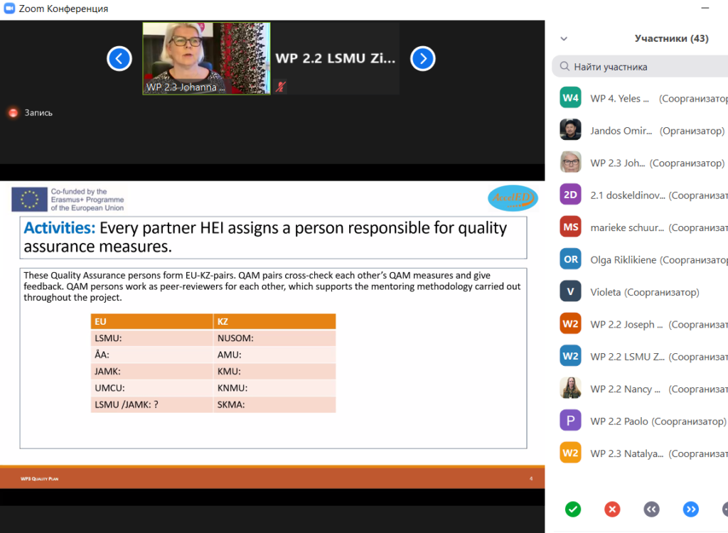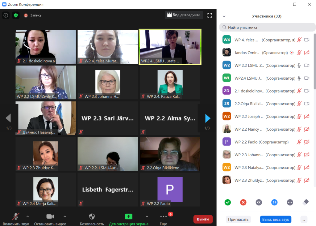 The meeting was attended by representatives of the National Office of the Erasmus+ Program, WHO, the Ministry of Education and Science of the Republic of Kazakhstan, the Ministry of Health of the Republic of Kazakhstan, the Republican Center for Health Development, the “Paryz” Nursing Association, medical universities of Kazakhstan, Lithuania, Finland and the Netherlands.