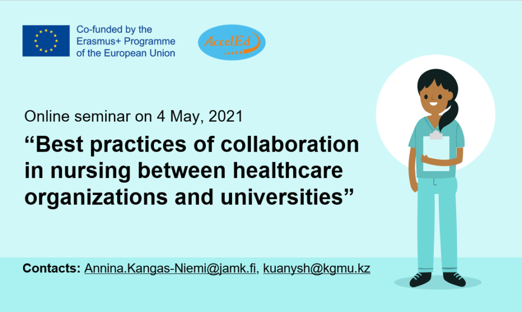 The online seminar is part of the AccelEd project (“Accelerating Master and PhD Level Nursing Education Development in the Higher Education System in Kazakhstan”), which is co-funded by the EU through the Erasmus+ implementing innovative projects to increase capacity and reform higher education.