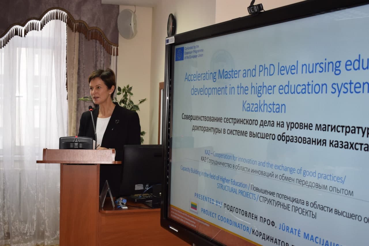 Круглый стол «Укрепление развития сестринского образования, исследований, практики и использование доказательного сестринского дела в Казахстане» прошел в Медицинском университете Астана 3 декабря, где приняли участие казахстанские партнеры из Министерства здравоохранения РК, Назарбаев университета, практикующие медсестры и главные медсестры организаций здравоохранения, а также европейские координаторы и менеджеры проекта. Европейскую сторону представили главный координатор проекта из Литовского университета наук о здоровье Юрате Мацияускене и координатор проекта в Университете прикладных наук Ювяскуля Йоханна Хейкилля.