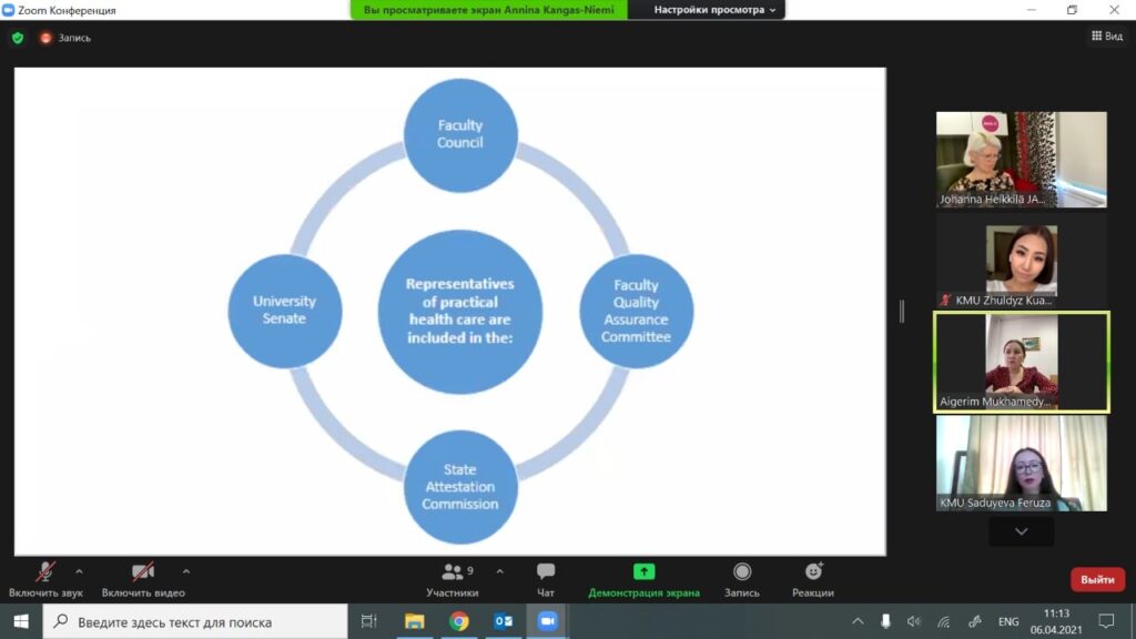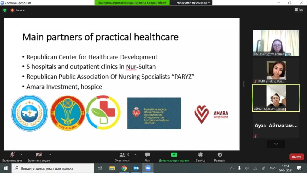 Сегодня, 6 апреля 2021 года, прошла дискуссия в рамках электронного бенчмаркинга с Медицинским университетом Астана о текущих практиках сотрудничества в сестринском деле с практическим здравоохранением. Дискуссия организована Университетом прикладных наук JAMK и Медицинским университетом Караганды в рамках проекта AccelEd.