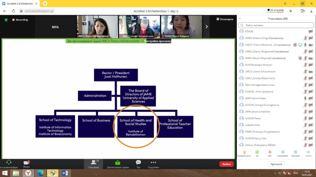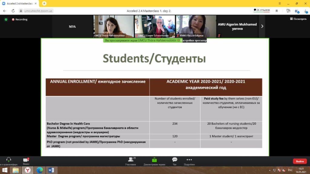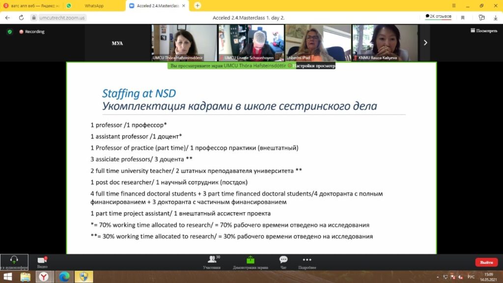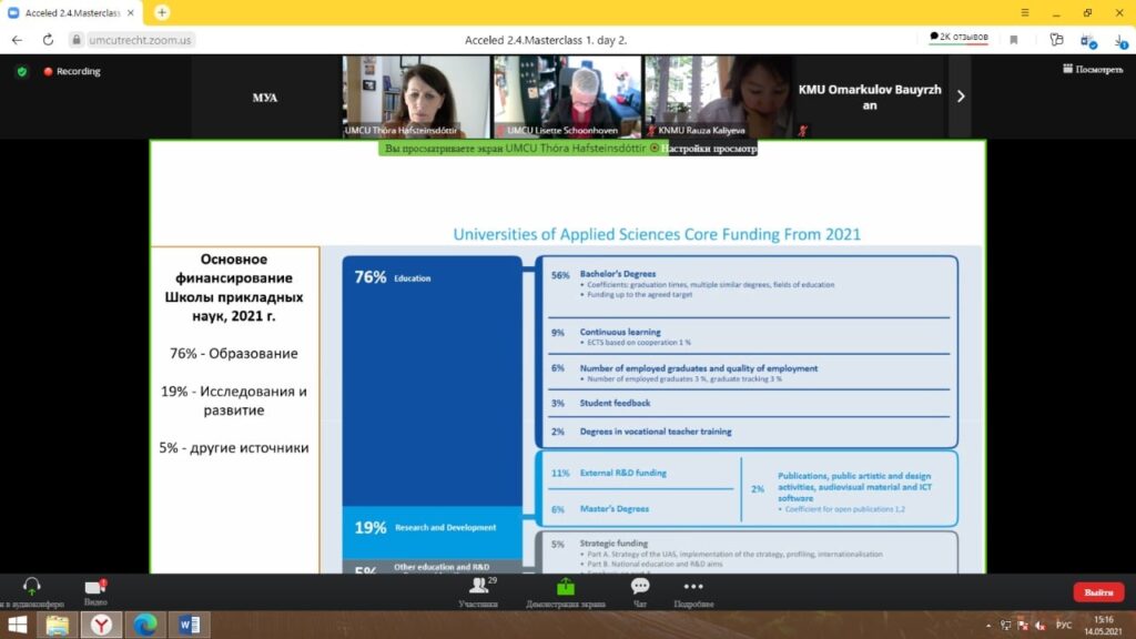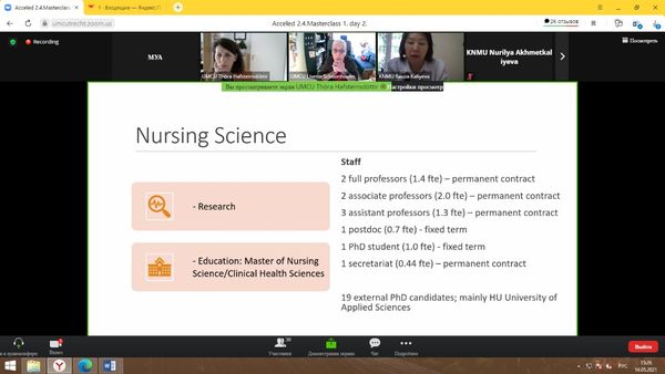 14 мая прошла вторая встреча мастер-класса «Бенчмаркинг лучших международных практик в управлении работой факультетов сестринского дела, сотрудничестве и организации образовательных программ PhD, и оценке Магистерских и PhD тезисных работ».