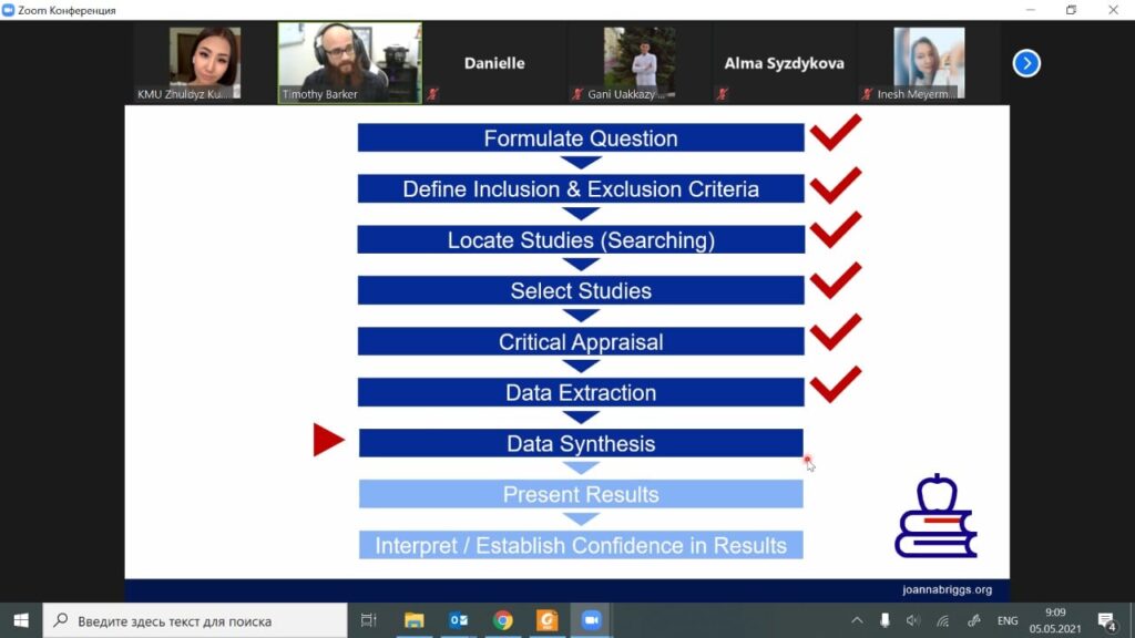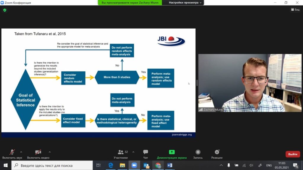 Сегодня начался 2 день 2 Модуля обучения с JBI. Сегодня участники разобрали синтез данных и мета-анализ, представление и доработку отчета, обзоры распространенности и заболеваемости, этиологии и рисков. Участники имели возможность презентовать свои презентации, в которых представили свой исследовательский вопрос и критерий включения и исключения для обзора по эффективности. Лектора тренинга дали обратную связь, и теперь участники тренинга продолжат работу над своим обзором в программе SUMARI.